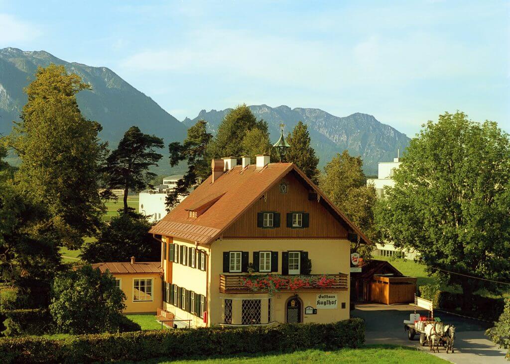 Der war im vergangenen Jahrhundert der Landwirtschafts-Hof der Guglbrauerei zu Salzburg, heißt also ursprünglich Guglhof und hat mit der Kugel, wie man doch vermuten möchte, somit gar nichts zu tun. Seit 1911 im Besitz der Stieglbrauerei Salzburg, ist der eines von nur mehr ein paar wenigen Gasthäusern, die auch heute noch mit dem traditionellen Stiegl-Pferdegespann beliefert werden. Und auch Stiegl´s Hausbiere werden bei uns frisch gezapft – eine echte Rarität! 1935 abgebrannt, 1936 wieder aufgebaut und erweitert, hat der doch eine bewegte Geschichte hinter sich. 1936 erhielt er eine für damalige Verhältnisse sensationelle Lehmbahn mit Nadelstreu und zog die Salzburger Stockschützen an, die ihm bis heute treu geblieben sind. Die Lehmbahn ist zwar einer aus Asphalt gewichen, die Begeisterung ist aber dieselbe geblieben und so dürfen wir uns nach wie vor als "Stammlokal" der Maxglaner Stockschützen benennen. Die Stockschützen gehören ebenso untrennbar zum typischen -Bild wie die unzähligen Radfahrer und Spaziergänger, die spielenden, lachenden Kinder und schlummernden Hunde. Sie alle bevölkern in der warmen Jahreszeit den großen, schattigen Gastgarten mit den anmutigen, alten Kastanienbäumen und machen es sich winters in den heimeligen Stuben gemütlich. Aufrichtige Herzlichkeit, Gastfreundschaft und Gemütlichkeit werden seit jeher im gelebt und versprechen gemeinsam mit einer authentisch-traditionellen, ehrlich-einfachen und zugleich liebevoll kreativ-inspirierten Küche ein besonderes Erlebnis.